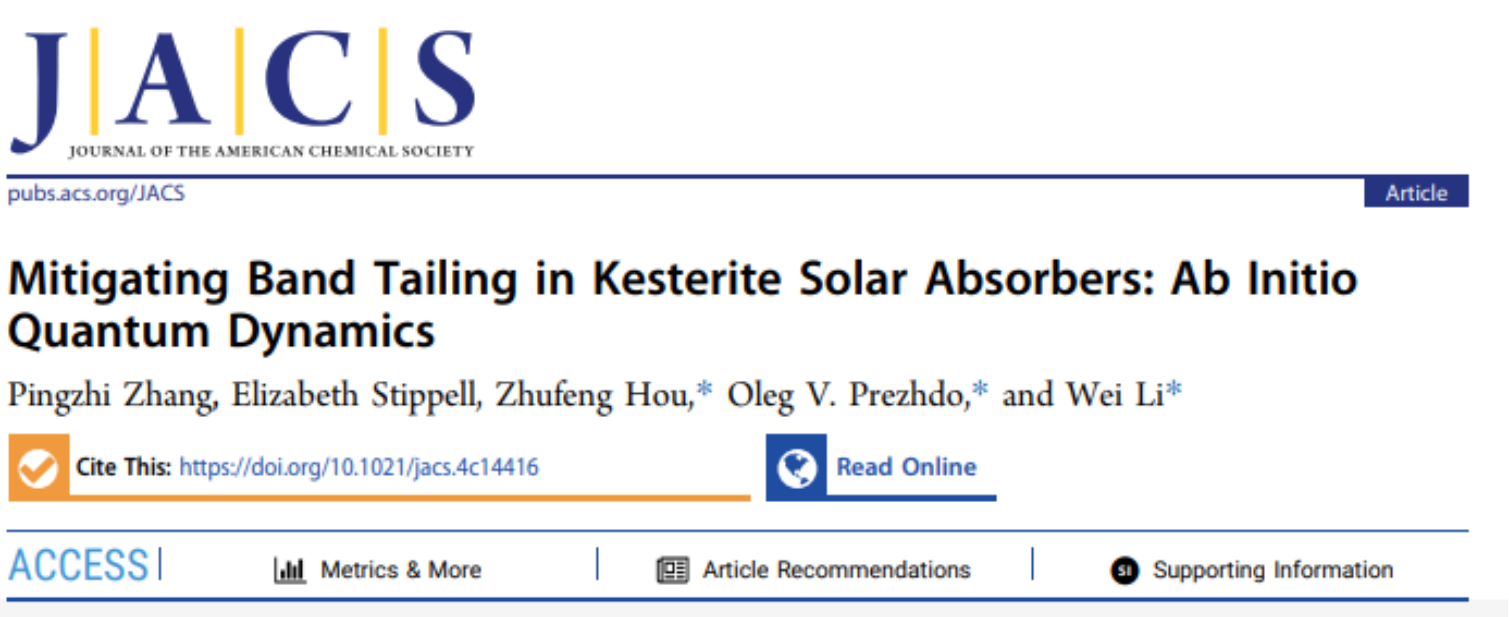 本网讯(化学与材料科学学院 周文)近日,化学与材料科学学院李位教授课题组在四元化合物半导体铜锌锡硫(CZTS)太阳能电池带尾效应的形成与消除机制研究中取得重要进展。相关研究成果以“Mitigating Band Tailing in Kesterite Solar Absorbers: Ab Initio Quantum Dynamics”为题在线发表于国际化学领域顶级期刊《Journal of the American Chemical Society》(JACS,中文名称:《美国化学会志》,美国化学会旗舰期刊,中国科学院一区top,最新影响因子:14.5)。化材学院2023级硕士研究生张平治为第一作者,李位教授、中国科学院福建物构所侯柱锋副研究员和美国南加州大学的Oleg V. Prezhdo教授为共同通讯作者,beat365英国官方网站为第一完成单位。