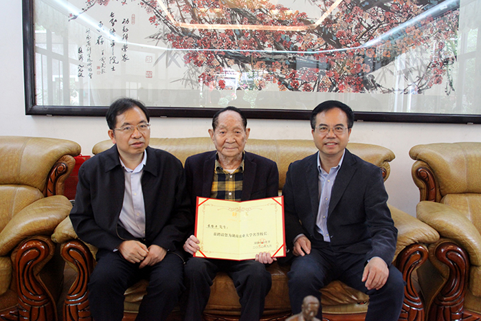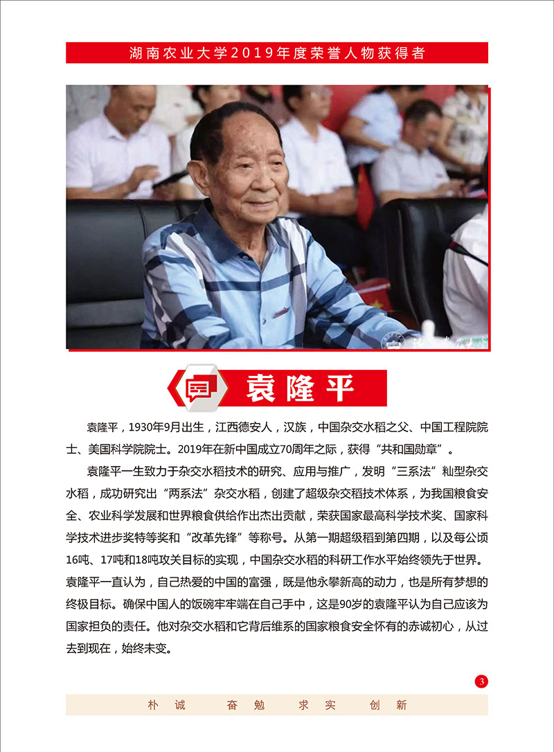 摄影|熊赳2020年9月28日,校长邹学校院士向共和国勋章获得者、杰出科学家袁隆平院士颁发了名誉校长聘书,党委书记陈弘教授主持聘任仪式,代表全校师生向袁隆平院士表示衷心感谢和崇高敬意,祝福袁隆平院士身体健康,中秋国庆快乐。袁隆平在仪式上高兴地说:“今年中秋国庆同一天,真是千载难逢的好日子。我非常荣幸担任湖南beat365的名誉校长。农业现代化、粮食安全关键在科技、在人才,农业大学要多培养懂农业、爱农村的优秀人才,多出能解决实际问题、发展农业产业、帮助农民富裕的科技成果。”袁隆平(1930.9.7- )出生于北平,1953年毕业于西南农学院。1964年开始研究杂交水稻,1973年实现三系配套,1974年育成第一个杂交水稻强优组合南优2号,1975年研制成功杂交水稻制种技术,从而为大面积推广杂交水稻奠定了基础。1985年提出杂交水稻育种的战略设想,为杂交水稻的进一步发展指明了方向。1987年任863计划两系杂交稻专题的责任专家,1995年研制成功两系杂交水稻,1997年提出超级杂交稻育种技术路线,2000年实现了农业部制定的中国超级稻育种的第一期目标,2004年提前一年实现了超级稻第二期目标。1995年当选为中国工程院院士。先后获得“国家特等发明奖”、“首届最高科学技术奖”等多项国内奖项和联合国“科学奖”、“沃尔夫奖”、“世界粮食奖”等11项国际大奖。出版中、英文专著6部,发表论文60余篇。