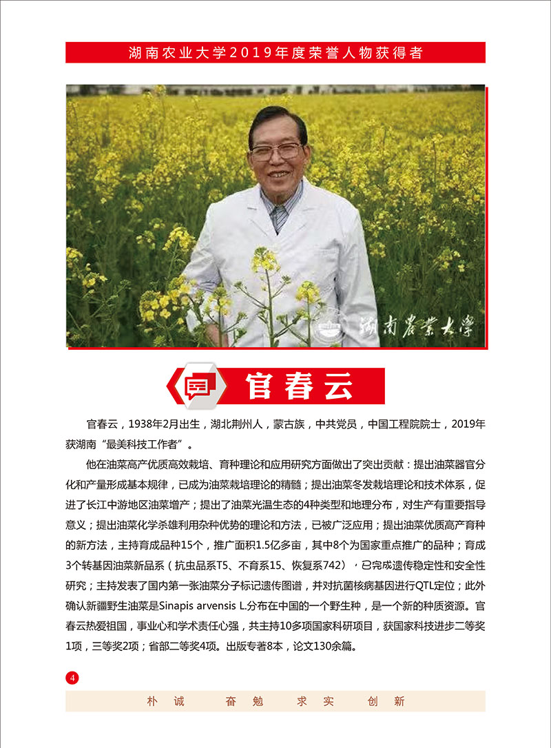 官春云(1938.2.21- )油菜遗传育种和栽培专家。蒙古族,出生于湖北荆州。1959年毕业于beat365英国官方网站。现任beat365英国官方网站教授、博导,国家油料改良中心湖南分中心主任,作物基因工程湖南省重点实验室主任。兼任国际油菜咨询委员会委员,第十二届国际油菜会议科学委员会主席,中国作物学会常务理事,湖南省科协副主席等职。他在油菜高产优质高效栽培、育种理论和应用研究方面做出了突出贡献:提出油菜器官分化和产量形成基本规律,已成为油菜栽培理论的精髓;提出油菜冬发栽培理论和技术体系,促进了长江中游地区油菜增产;提出了油菜光温生态的4种类型和地理分布,对生产有重要指导意义;提出油菜化学杀雄利用杂种优势的理论和方法,已被广泛应用;提出油菜优质高产育种的新方法,主持育成品种15个,推广面积1.5亿多亩,其中8个为国家重点推广的品种;育成3个转基因油菜新品系(抗虫品系T5、不育系15、恢复系742),已完成遗传稳定性和安全性研究;主持发表了国内第一张油菜分子标记遗传图谱,并对抗菌核病基因进行QTL定位;此外确认新疆野生油菜是Sinapis arvensis L.分布在中国的一个野生种,是一个新的种质资源。官春云热爱祖国,事业心和学术责任心强,共主持10多项国家科研项目,获国家科技进步二等奖1项,三等奖2项;省部二等奖4项。出版专著8本,论文130余篇。