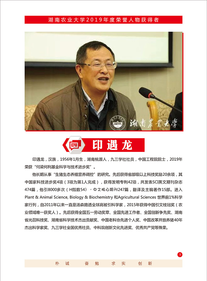 印遇龙,男,汉族,1956年1月生,湖南常德市桃源县人,博士,中国工程院院士,博士生导师,主要从事动物营养与饲料学研究。现任湖南省科学技术协会第十届全省委员会副主席。中国共产党湖南省第九次代表大会代表,湖南省直机关和中国科学院模范共产党党员,九三学社全国优秀社员,湖南省政协常委,湖南省海外联谊会常务理事,湖南省九三学社省委委员,动物营养学国家重点实验室、生物饲料安全与污染防控国家工程实验室和中国科学院亚热带农业生态系统过程重点实验室学术委员会委员,国际食品、农业与环境学会常务理事(芬兰)及Journal of Food, Agriculture & Environment和African Journal of Food Science杂志副主编,International Scholarly Research Network (ISRN) Veterinary Science, Journal of Microbiology and Antimicrobials 和Asian-Australasian Journal of Animal Science等国际杂志编委,中国畜牧兽医学会科技专家动物营养学分会常务理事,中国微量元素与食物链研究会副理事长。共发表SCI英文期刊杂志474篇,中文核心期刊247篇,翻译及主编著作15部。