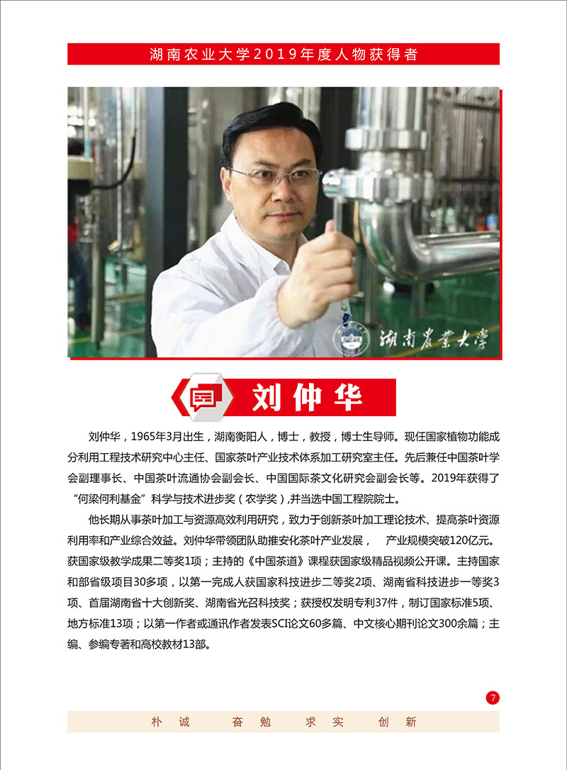 刘仲华(1965.3.14- ),男,茶学专家,湖南衡阳县人。1985年、1988年于湖南农学院茶学本科、硕士毕业,2014年获清华大学理学博士学位。现任beat365英国官方网站教授、国家植物功能成分利用工程技术研究中心主任、国家茶叶产业技术体系加工研究室主任、beat365英国官方网站茶学教育部重点实验室主任。