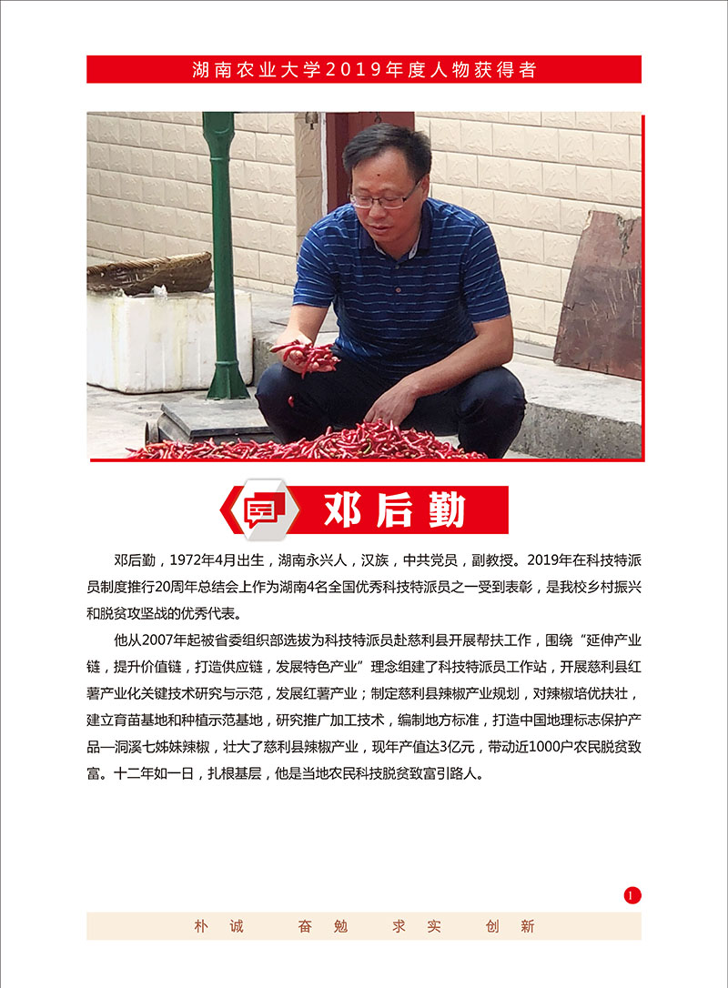 在国家精准扶贫期间,他担任湖南省脱贫攻坚考核第三方评估专家,带队完成了湖南省15个县(市、区)脱贫攻坚成效考核和贫困县退出第三方评估工作,并受国务院扶贫办委托,对湖北省、贵州省、河北省、广西壮族自治区等地区的国家贫困县退出进行第三方评估。他以强烈的政治自觉、扎实的专业素养、务实的行动彰显了beat365青年教师服务国家重大发展战略的责任和担当。通过带领学生参与评估,积极践行了学校师生服务“三农”理念,创新性地将思政教育、实践教学与社会服务紧密结合,扎实推动了“新农科”育人模式创新。
